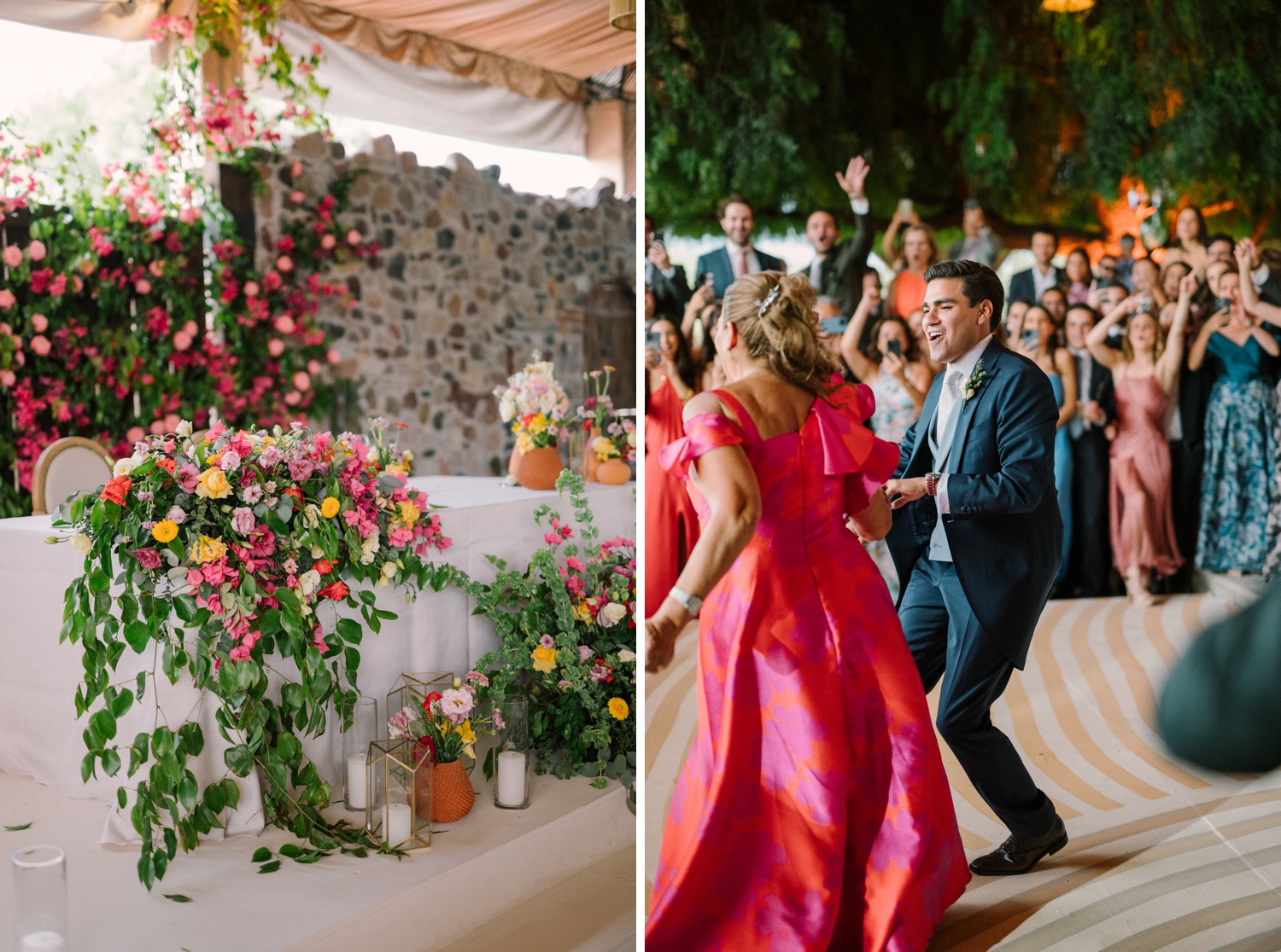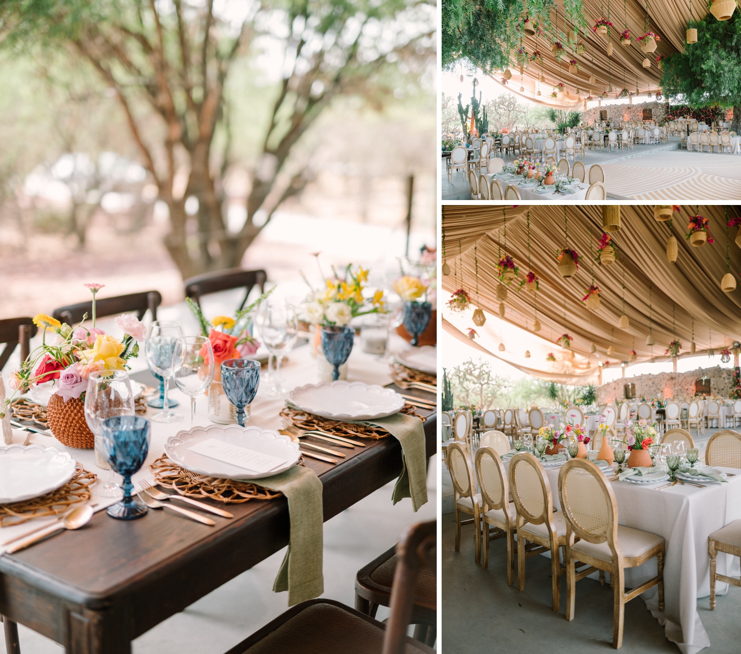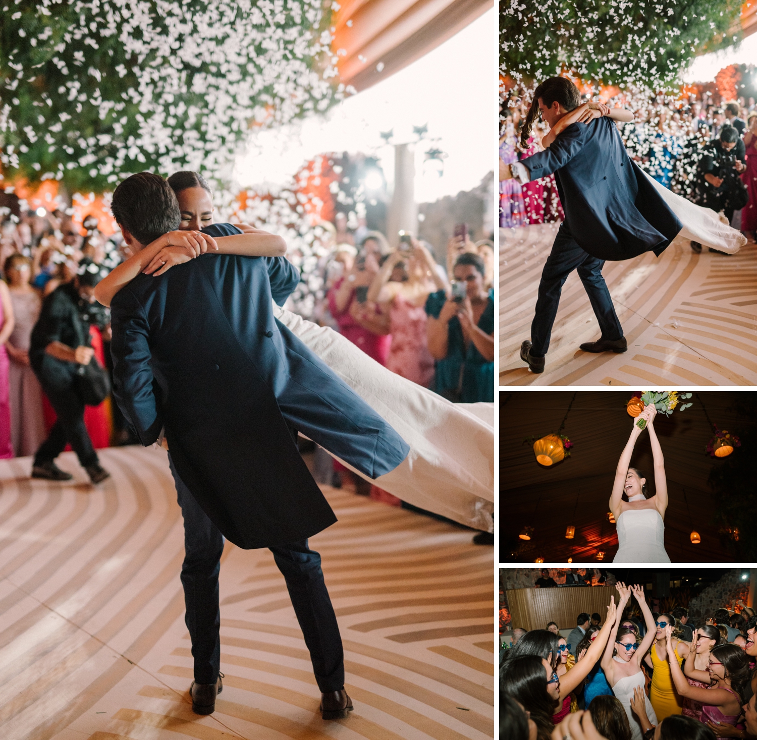 The couple chose to honor San Miguel’s rich landscape with florals and décor built around local materials: clay vases, woven baskets, desert vegetation, and towering mezquite trees that became a natural cathedral for cocktail hour. Penzi Weddings designed a reception that felt like a living painting—mimbre lamps glowing overhead, hand-painted dance floors, and candlelight flickering over cozy, organic tablescapes. Surrounded by friends and family, Renata and Agustin celebrated with bold margaritas, elevated Mexican cuisine, and unforgettable surprises, including traditional Mojigangas that swept the party into a joyful whirl.