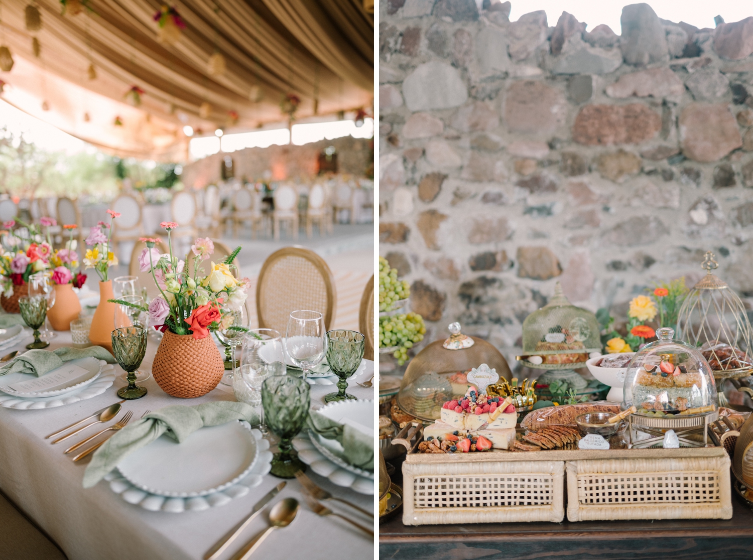 For the reception, we chose a place that screamed San Miguel from start to finish. The place had a beautiful forest of Mezquites (typical trees from the area) that was perfect for the cocktail. Enormous trees and cactus filled every corner and a magical runway of Agaves was the cherry on top. Because of this, with Penzi we chose to decorate using typical Mexican materials and textures. For the tables we chose small clay vases in different sizes and shapes that Penzi has been creating over the years. We complemented it with glass vases for small candles and mimbre baskets.