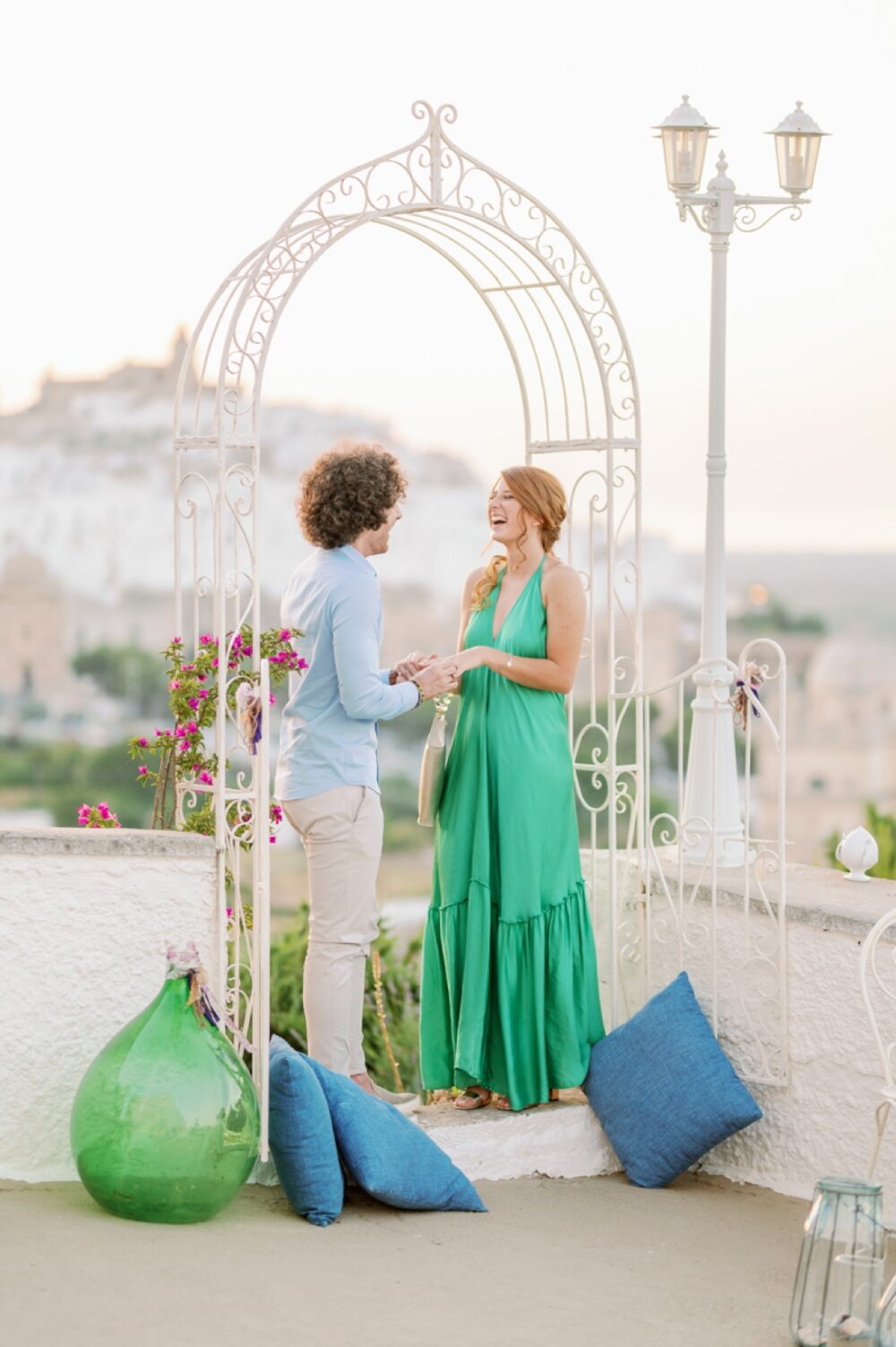from the planner: The unique landscape of the ‘white town’ of Ostuni, in Puglia, Southern Italy, inspired this romantic wedding proposal. Ostuni is a magical place for couples planning a destination proposal. A beautiful villa with stunning views, was the perfect setting for this wedding proposal inspiration.