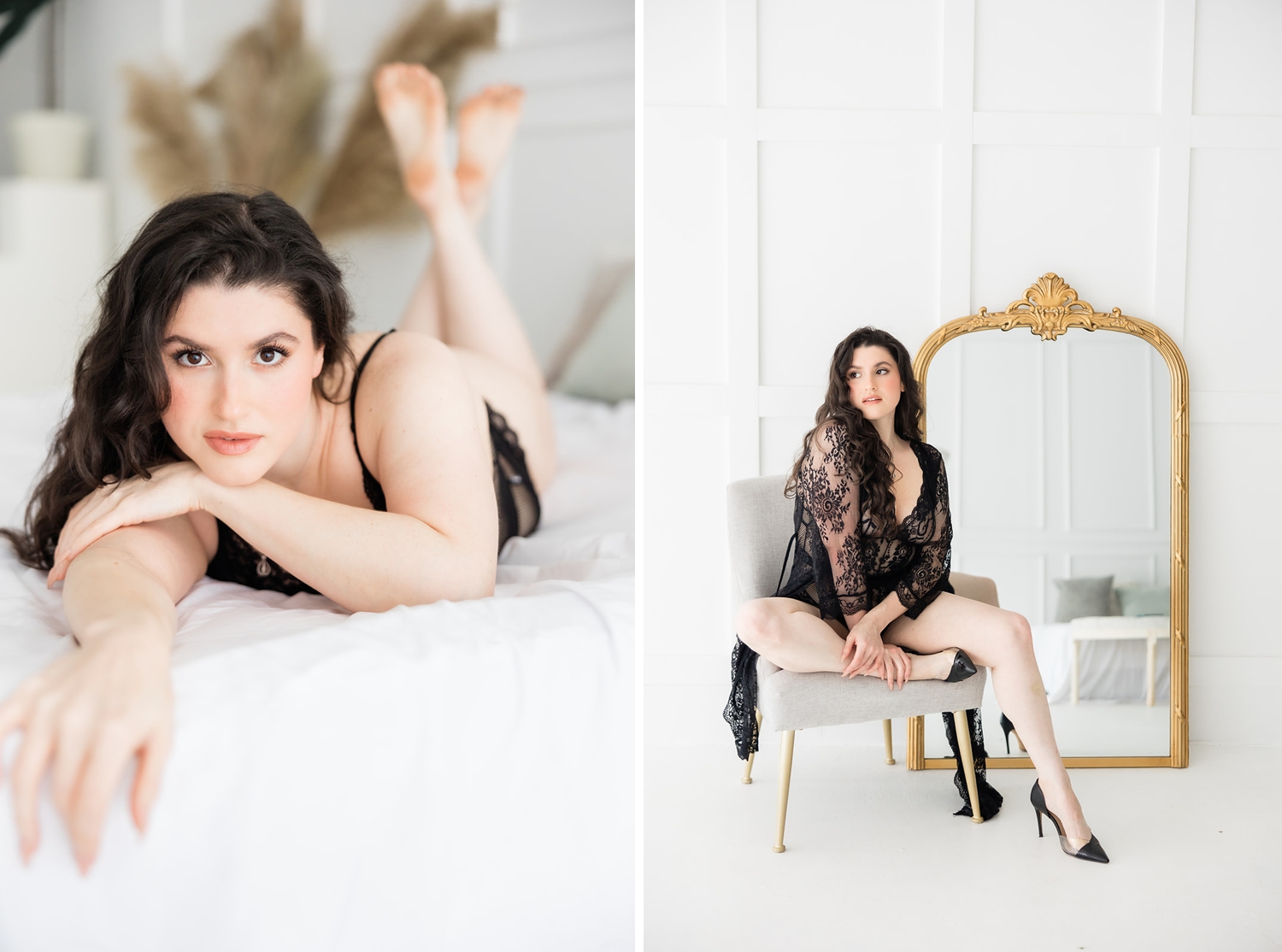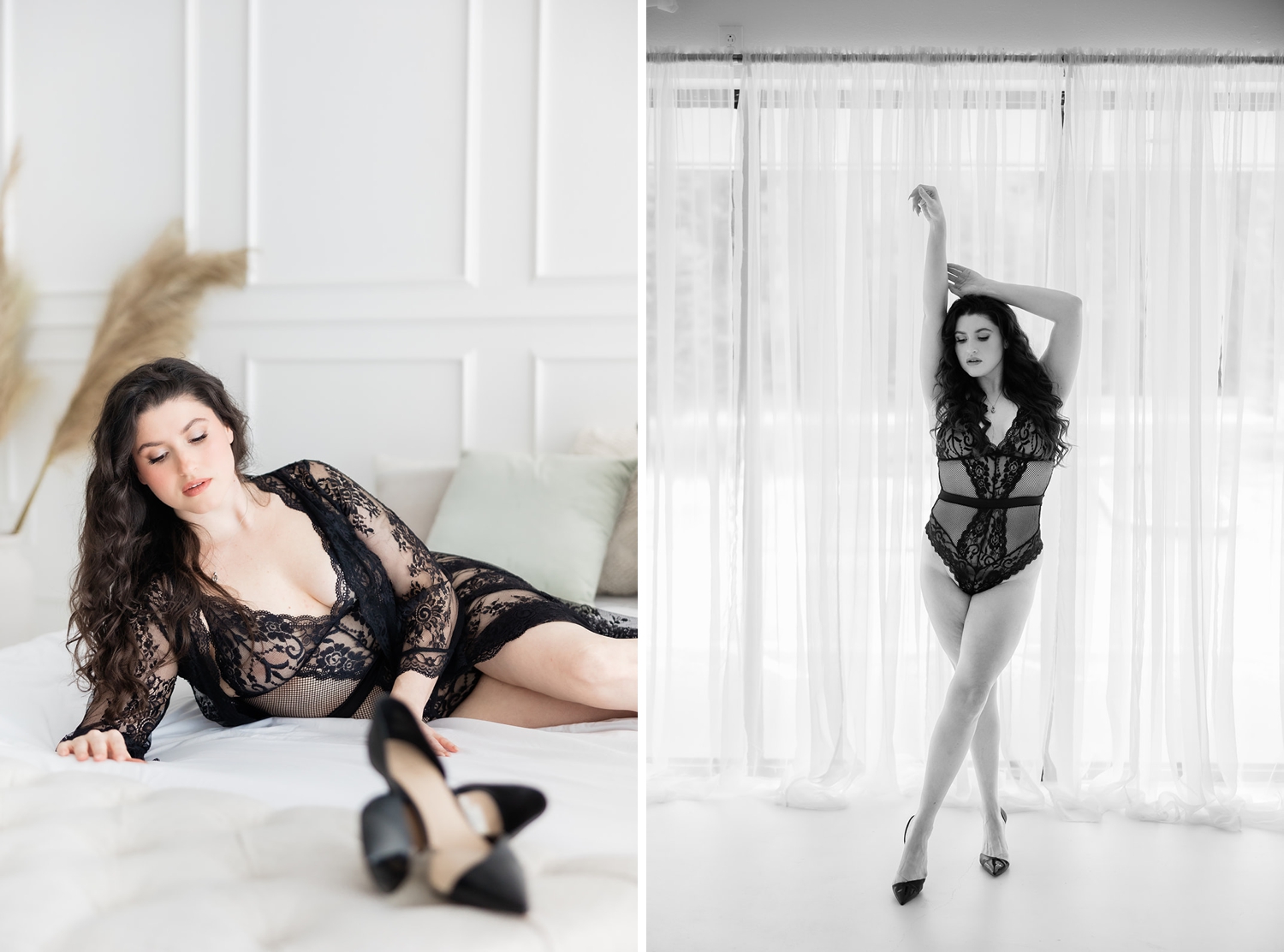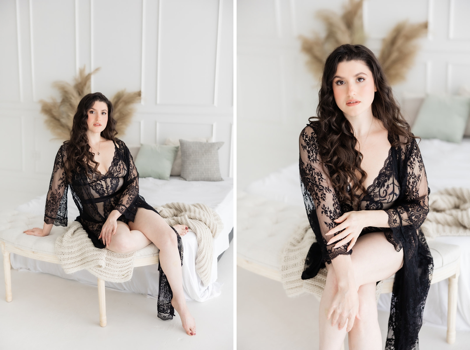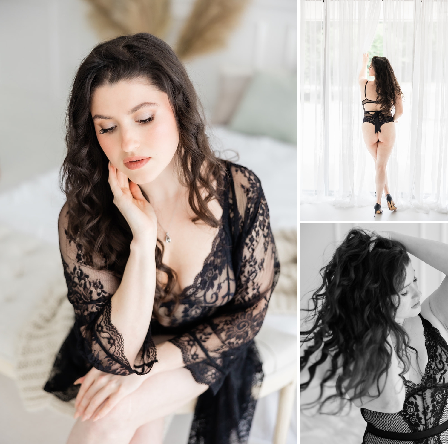 “Bold, confident, and effortlessly chic, this bridal boudoir session redefines elegance with an all-black look.”