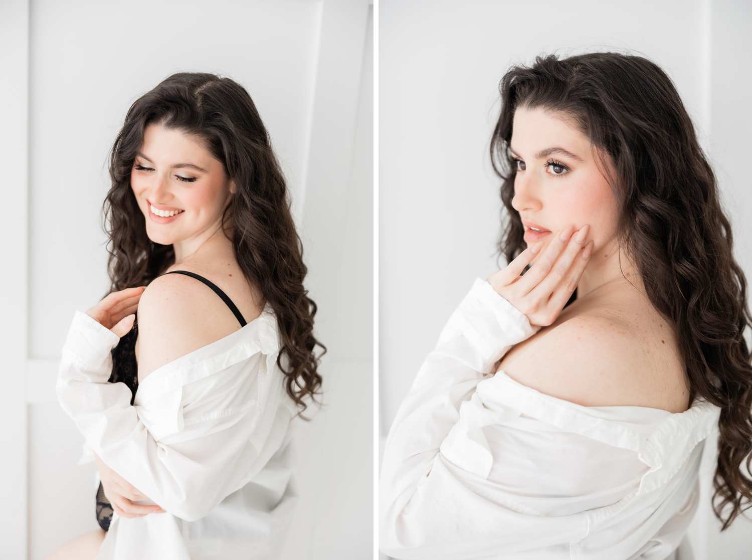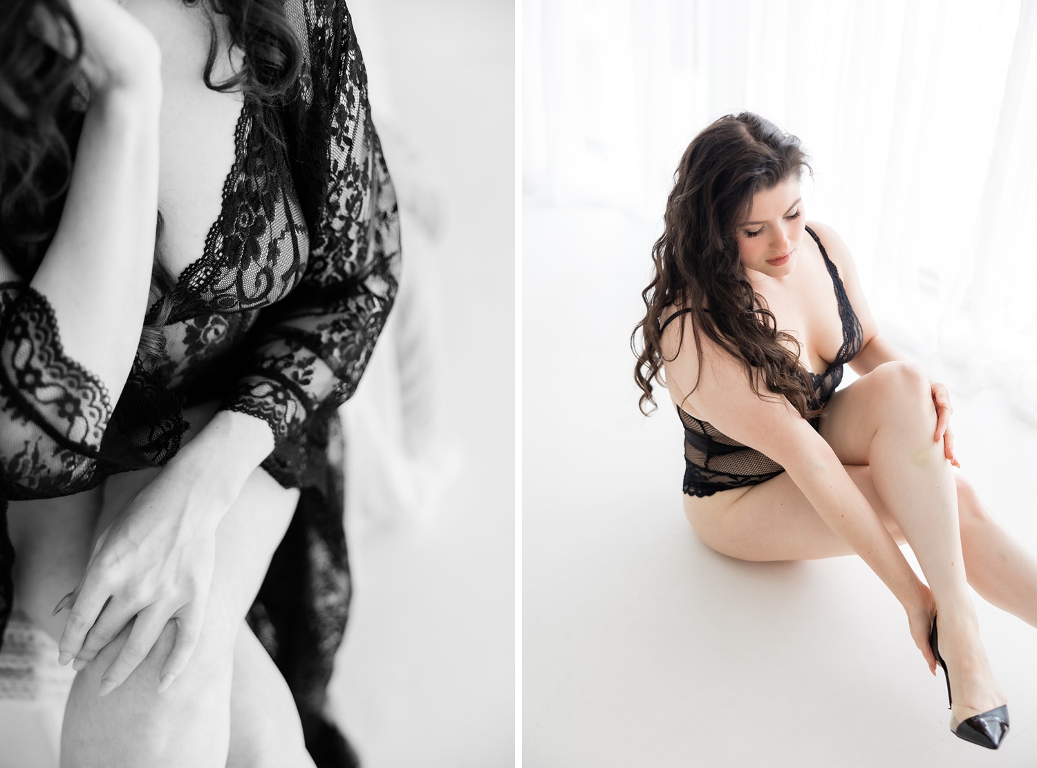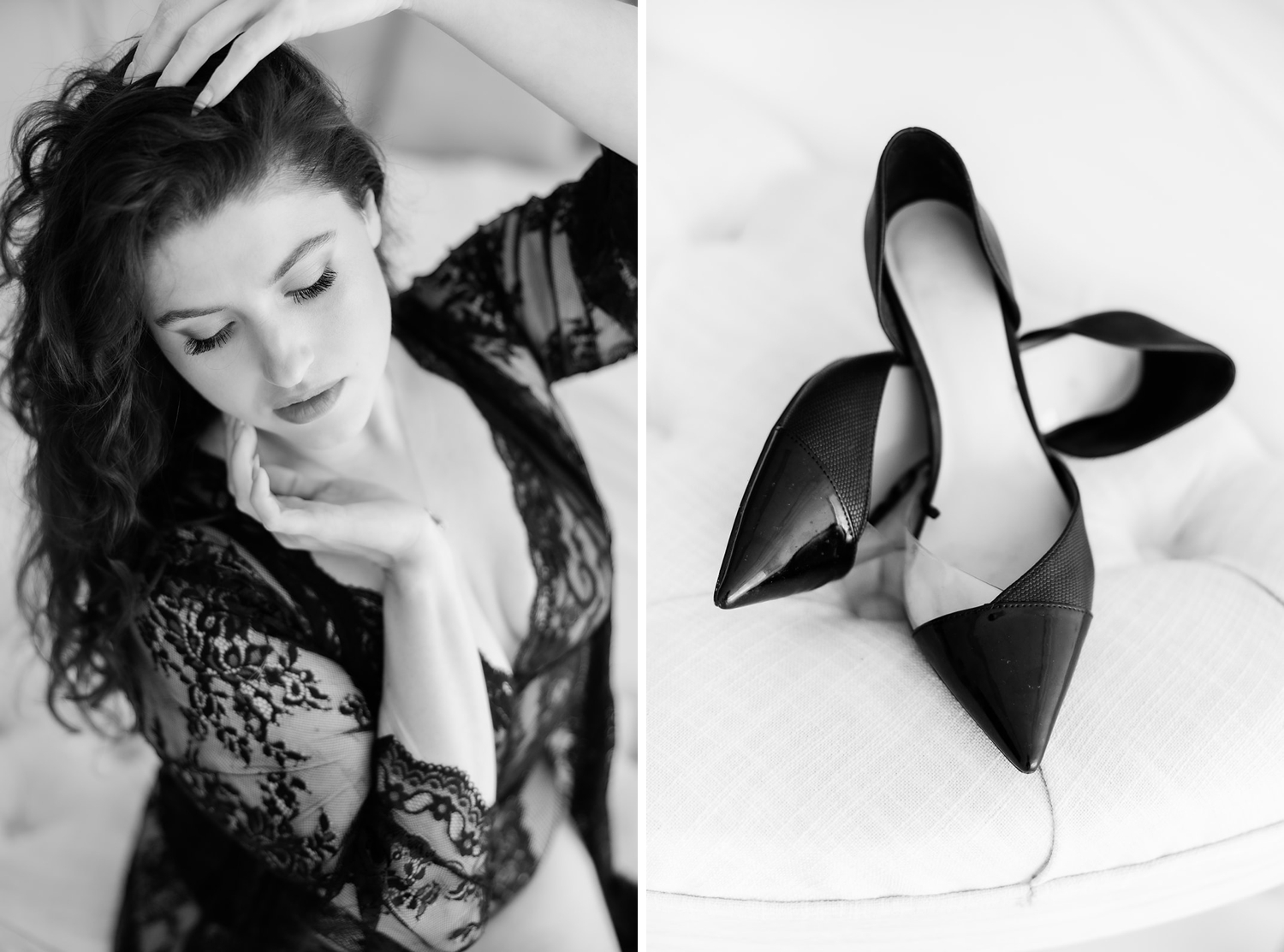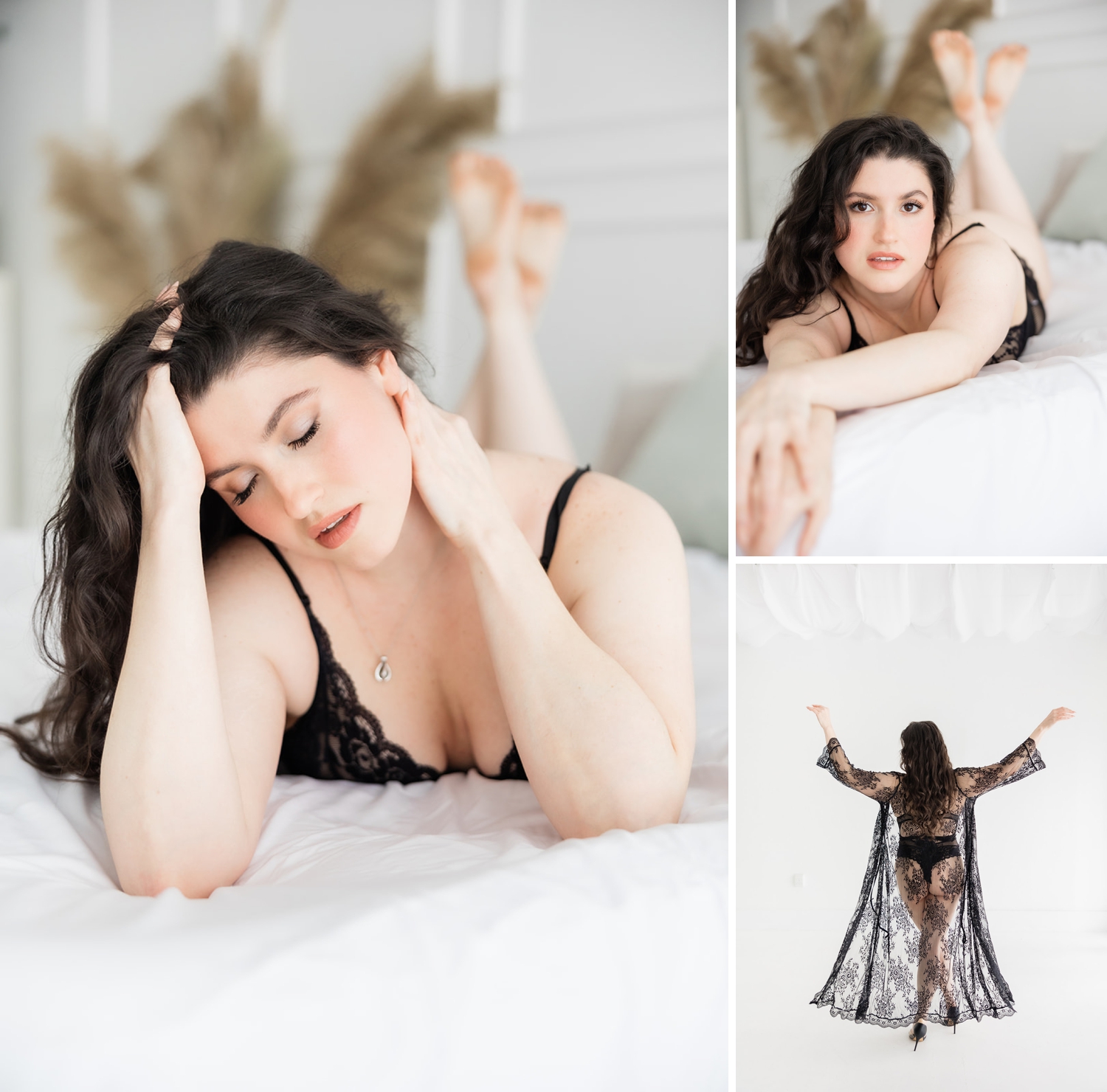 “Bold, confident, and effortlessly chic, this bridal boudoir session redefines elegance with an all-black look.”