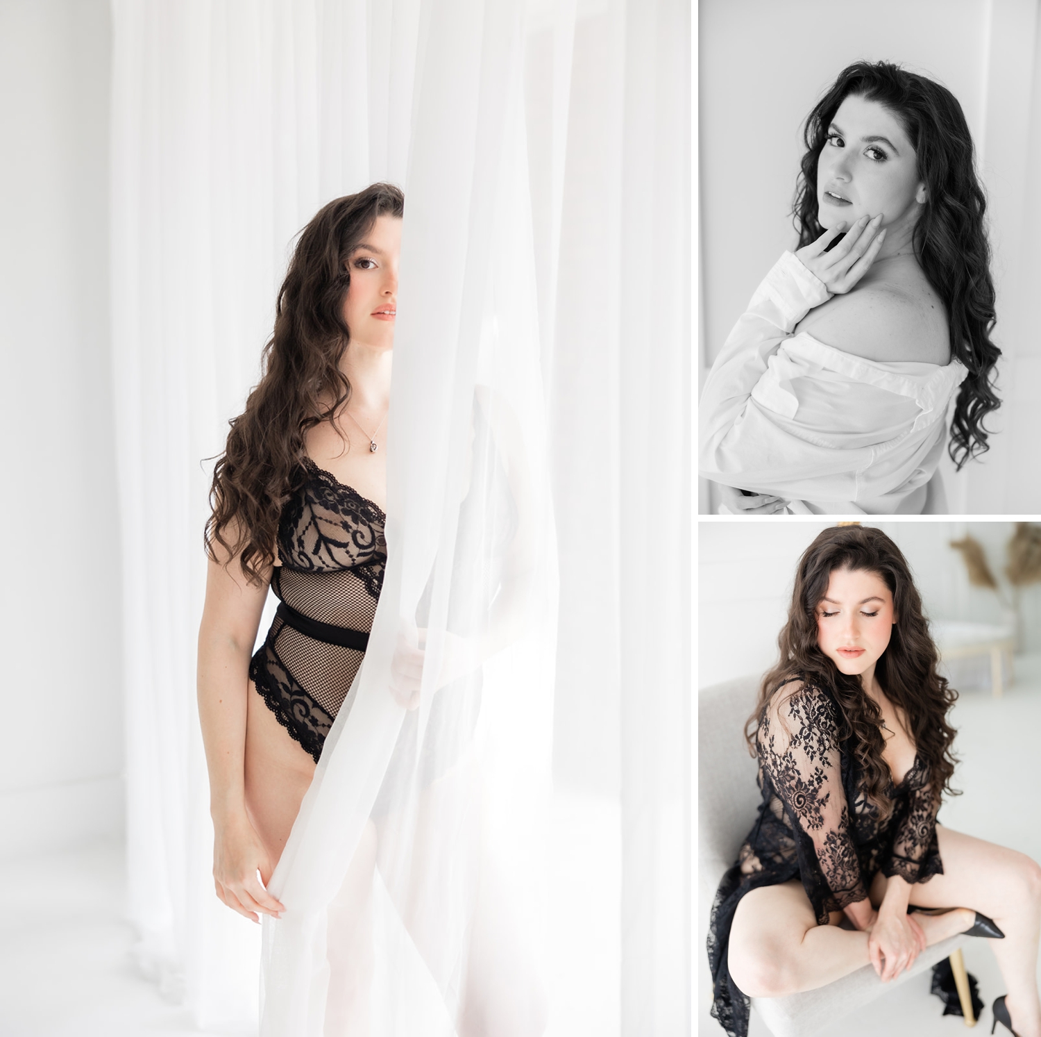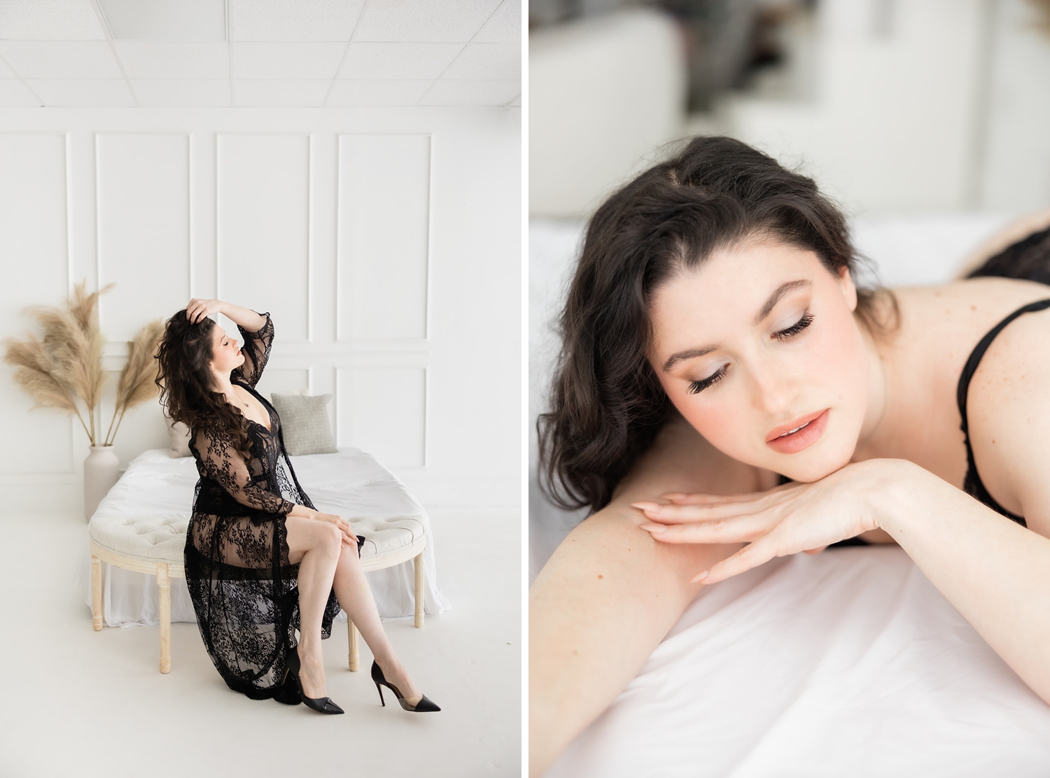 Set within the luminous Brand Studio Orlando, the soft natural light contrasts beautifully against the textures of black lace, silk, and sheer fabrics. LeighAnn’s look—complete with voluminous waves, sultry eyes, and a touch of classic glamour by LeighAnn Lights—exudes power and poise. Each frame captures the quiet strength and allure that boudoir photography embodies when done with intention and artistry.