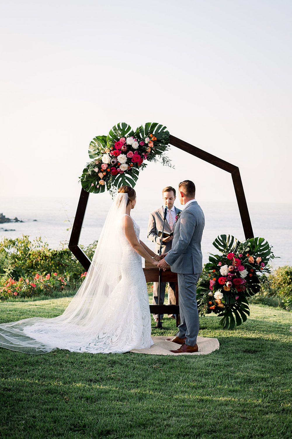 Kim & Jeff were married with a beautiful lawn ceremony overlooking the ocean! Their brightly colored wedding included a fun donkey photo booth for their guests! All the details pulled together the tropical feel of the environment, and we love the dinner plates with their colorful green plant pattern. The ceremony backdrop was a fun geometric shape with monstera leaves and colorful flowers adorning it.