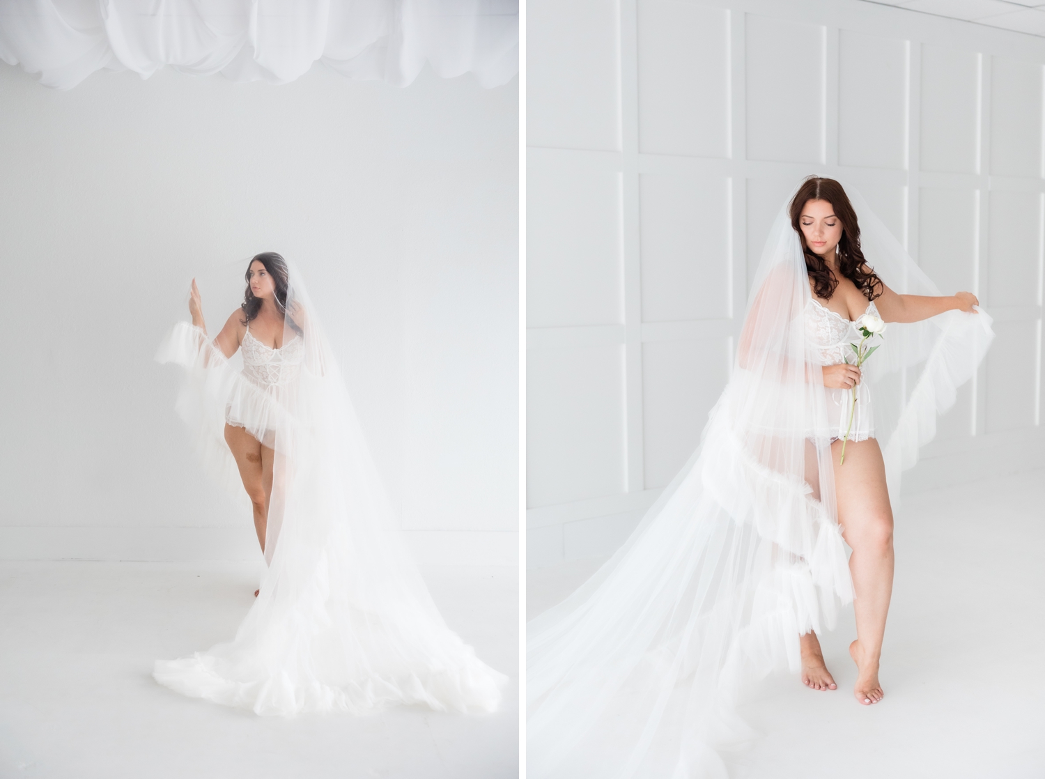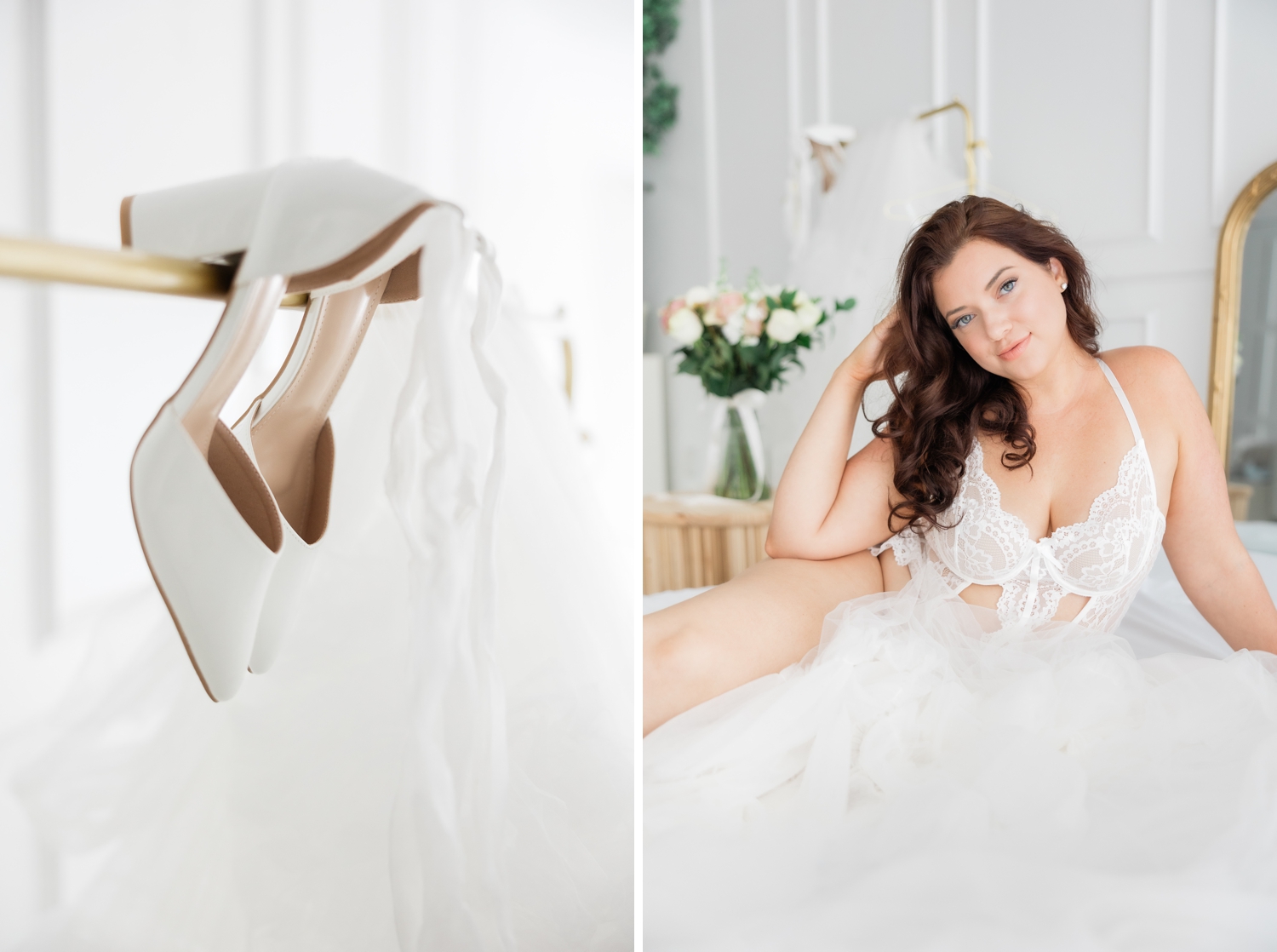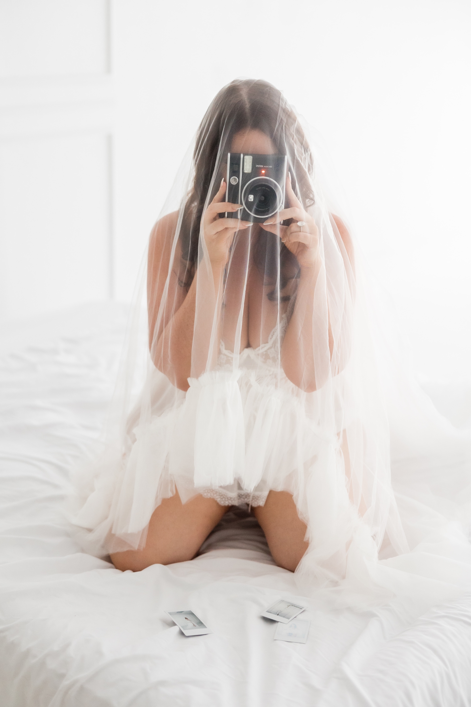 Set in the light-filled Brand Studio Orlando, the session embraces ethereal textures of lace, tulle, and airy fabrics. Elizabeth’s radiant smile and graceful presence are the heart of the shoot, paired with dainty details like white heels, fresh blooms, and Polaroid keepsakes that weave in modern bridal charm. Romantic, feminine, and effortlessly elegant—this gallery is a reminder of how bridal boudoir can become a meaningful part of the wedding journey.