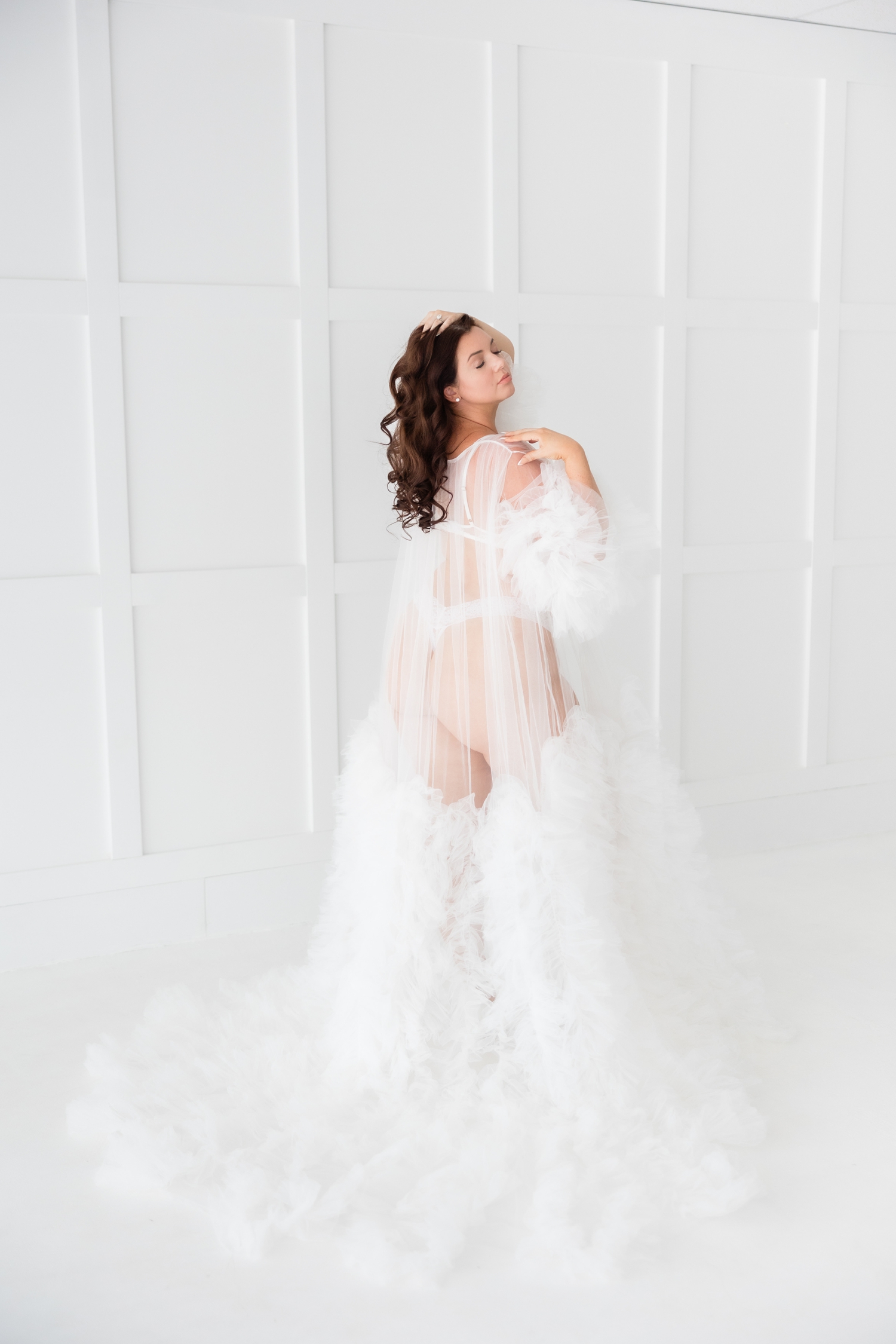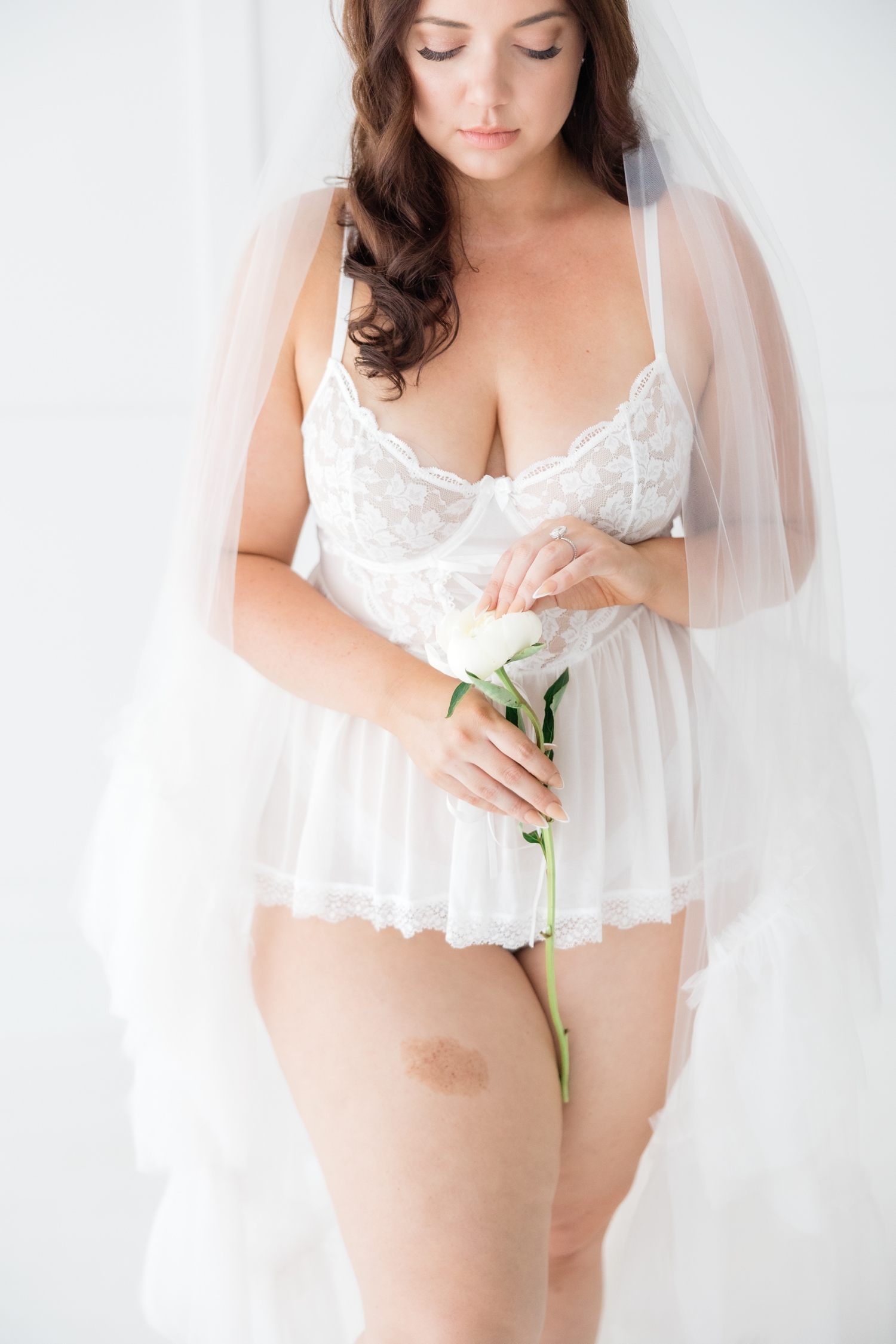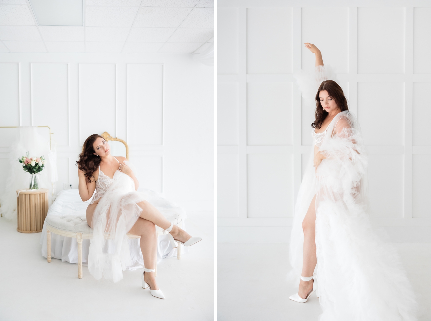 Set in the light-filled Brand Studio Orlando, the session embraces ethereal textures of lace, tulle, and airy fabrics. Elizabeth’s radiant smile and graceful presence are the heart of the shoot, paired with dainty details like white heels, fresh blooms, and Polaroid keepsakes that weave in modern bridal charm. Romantic, feminine, and effortlessly elegant—this gallery is a reminder of how bridal boudoir can become a meaningful part of the wedding journey.